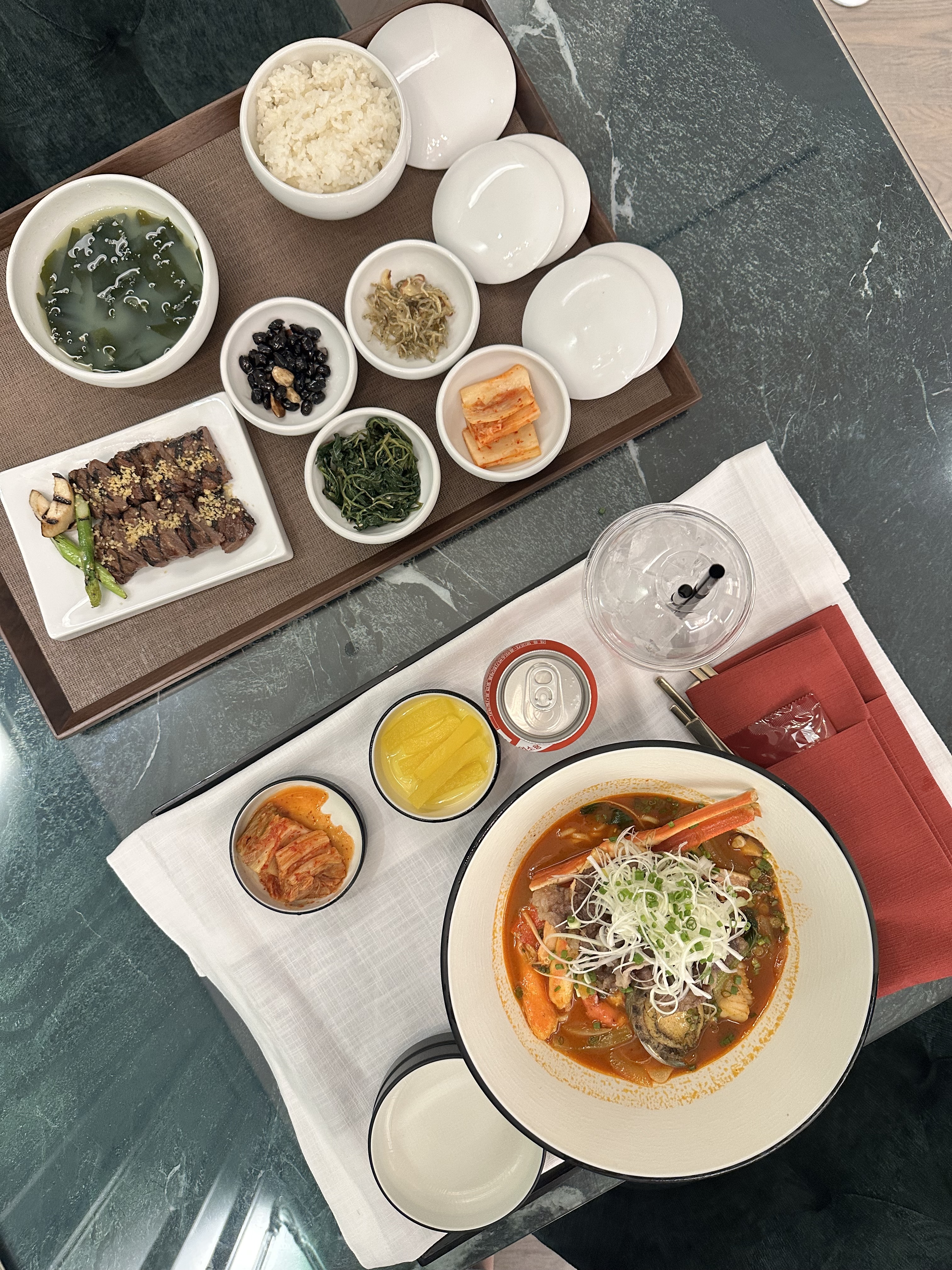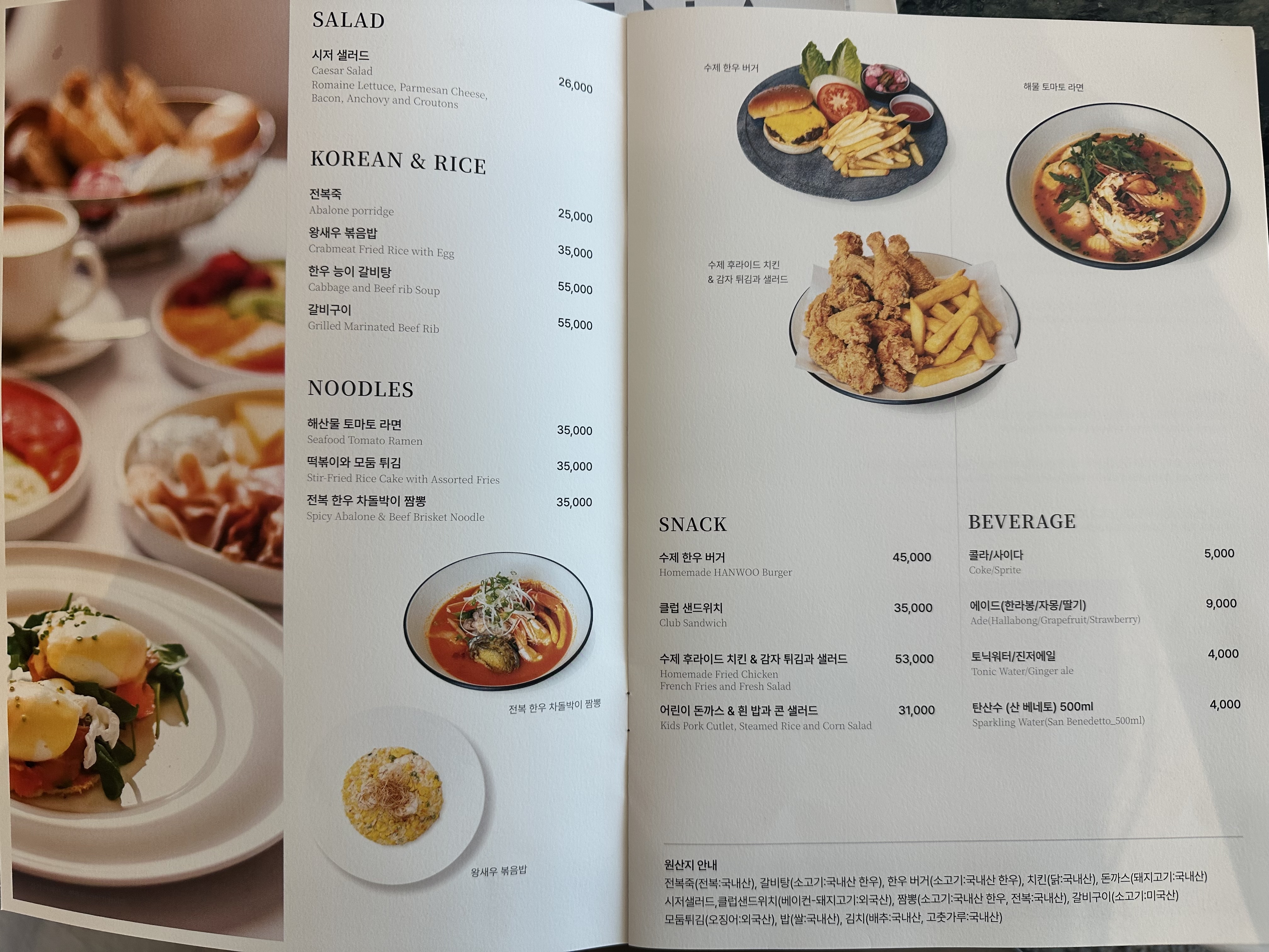 룸서비스 메뉴는 샐러드, 한식, 누들, 버거, 음료, 주류 등이 있고 우리는 '갈비구이'와 '전복 한우 차돌박이 짬뽕'을 주문했다.