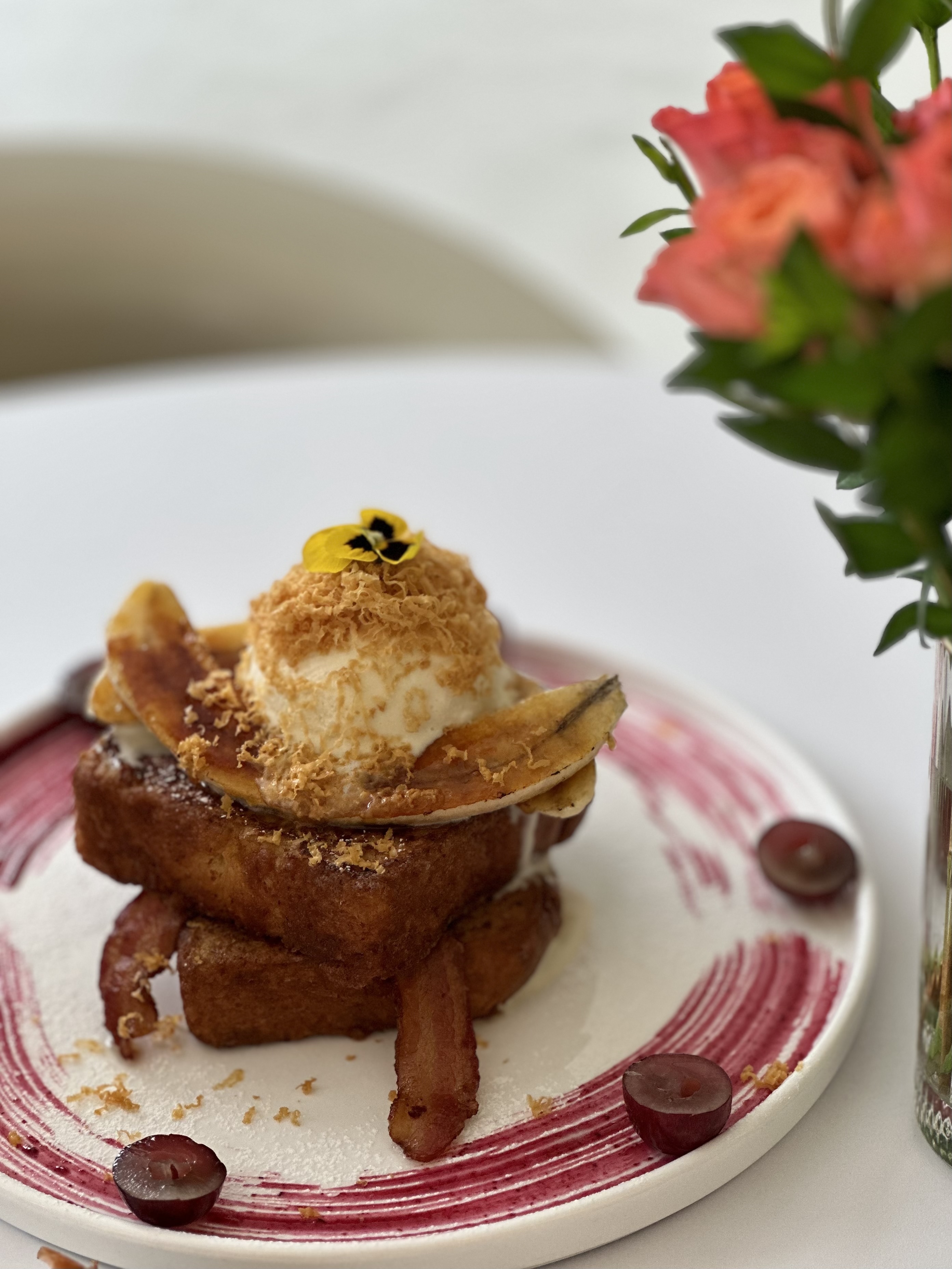 클래식 프렌치토스트는 빵 사이에 바삭하게 구운 베이컨이 들어 있고, 위에는 바닐라 아이스크림과 표면에 설탕을 입혀 살짝 그을린 바나나가 올려져 있는데 단짠단짠 조합이 완벽했다.