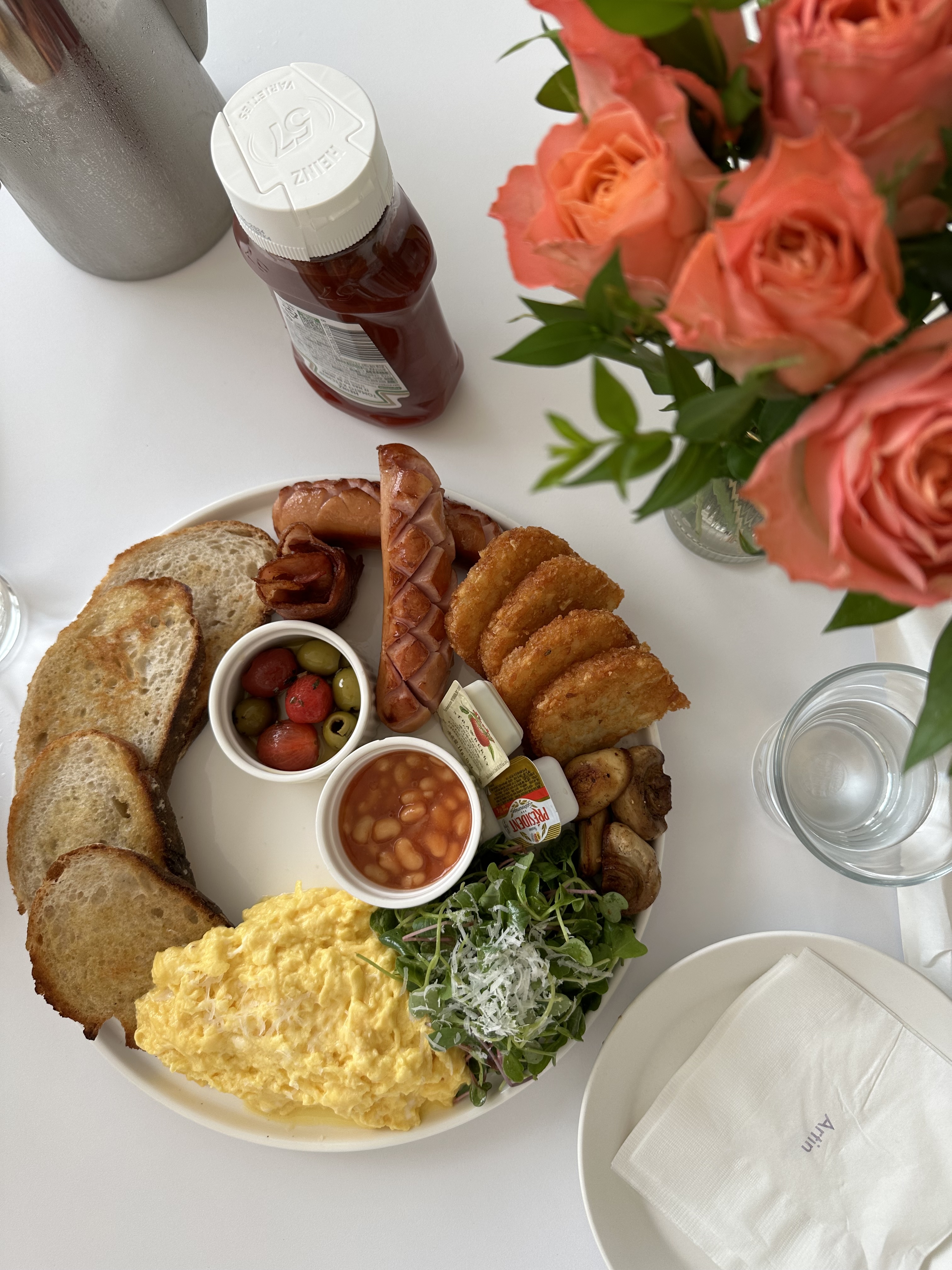 빅 블랙퍼스트는 빵, 스크램블에그, 소시지, 해쉬브라운, 구운 버섯, 샐러드 등으로 구성되어 있고 브런치 플레이트하면 많이 등장하는 구성이다.
