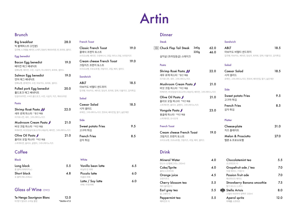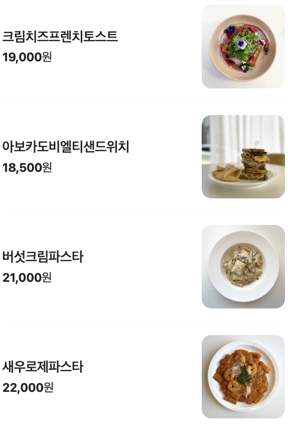 메뉴는 브런치와 디너로 나뉘고, 음료는 커피부터 와인까지 다양하게 즐길 수 있다.